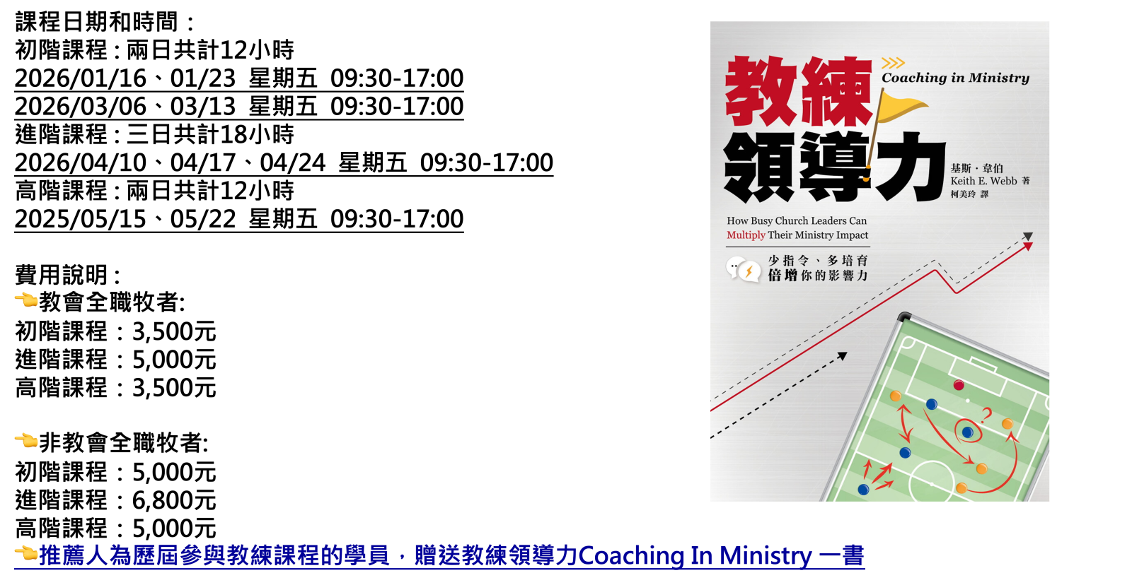 報名完成者,課前可閱讀參考書籍《教練的心》、《高績效教練》。